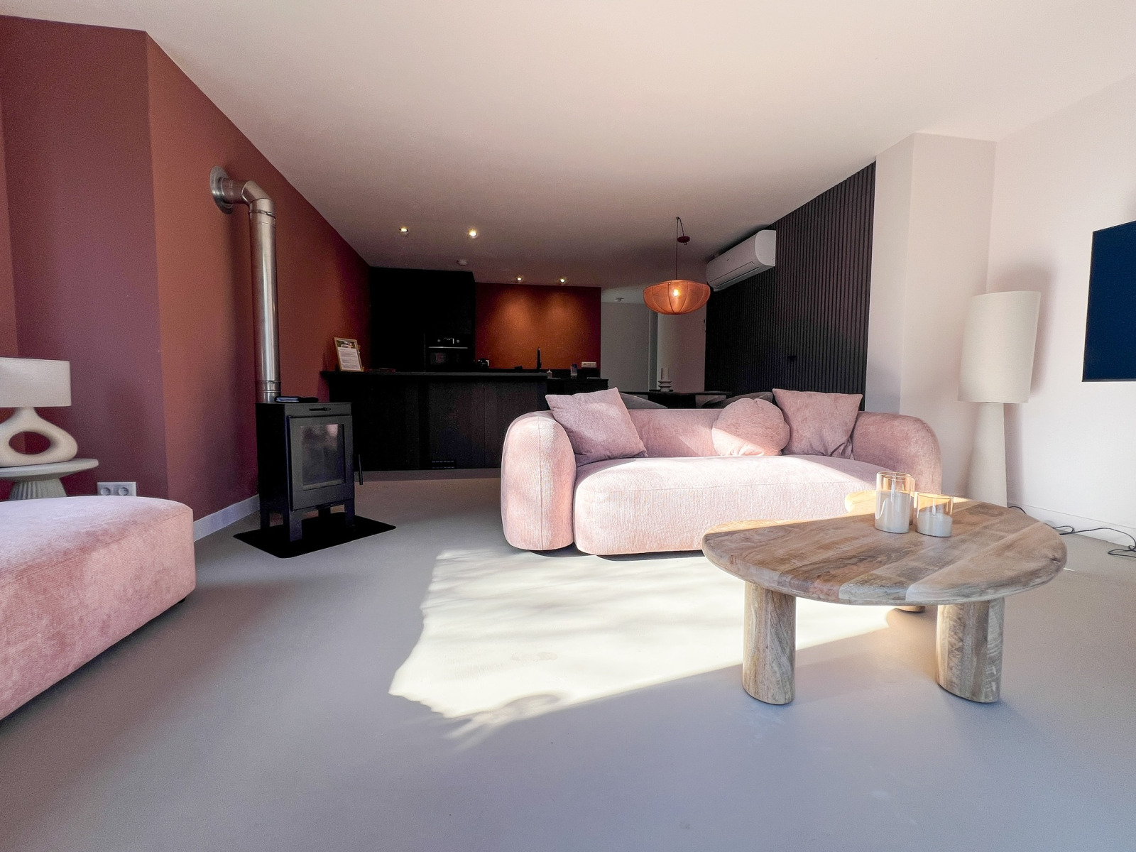 The bright and spacious living room features a large sliding door that lets in plenty of natural light. Here you will find a cozy dining area with four chairs and a comfortable sitting area with two sofas. The centrally placed wood-burning stove ensures warm and cozy evenings. There is also a Smart TV for extra relaxation.