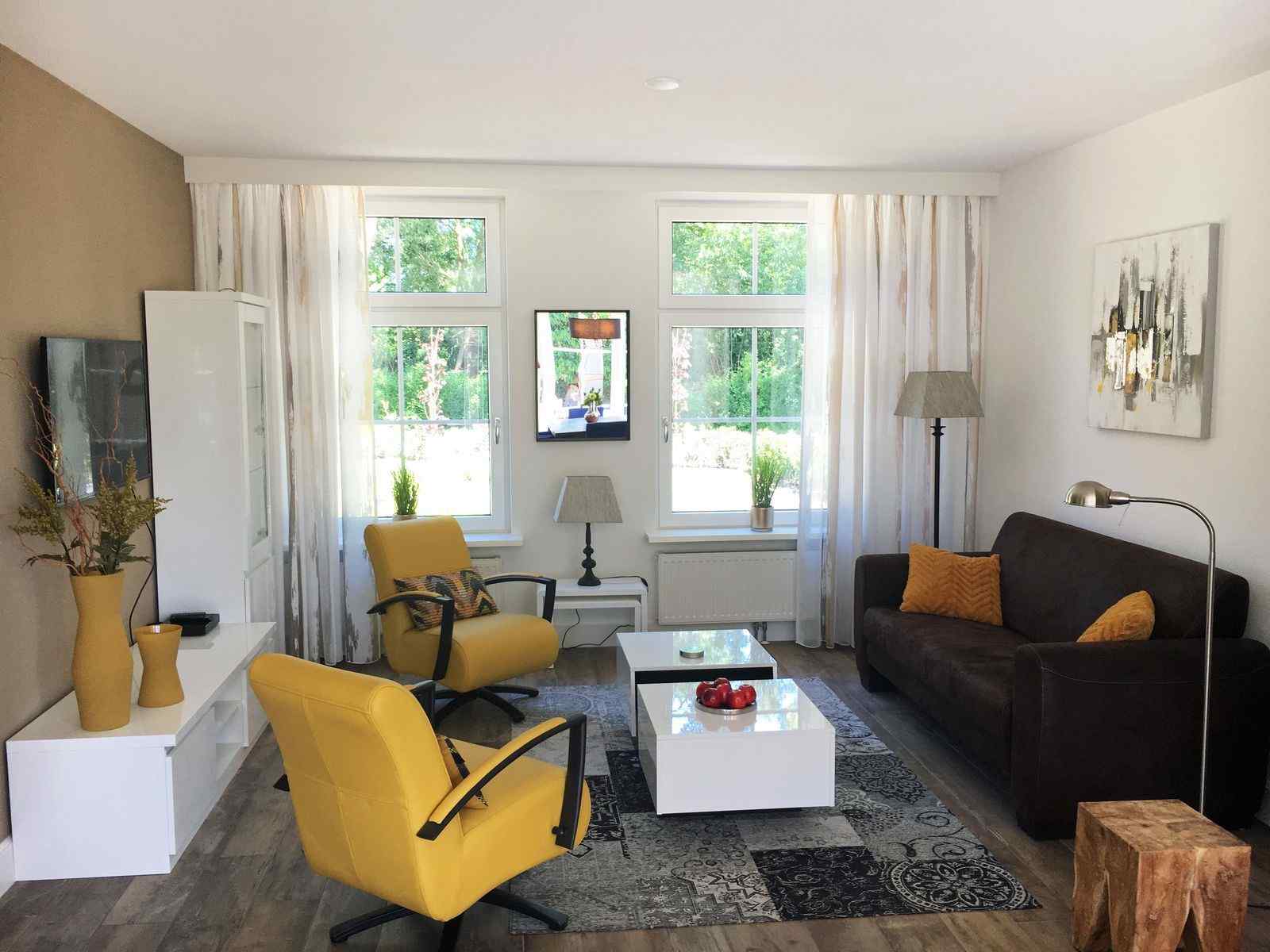 Cozy and comfortably furnished living room with sitting area with TV and DVD player, dining area and open kitchen. The kitchen has a four burner stove, microwave, oven, Senseo, dishwasher, fridge with freezer. Downstairs there is a bedroom with two single beds. There is also downstairs a bathroom with shower and sink and a separate toilet.