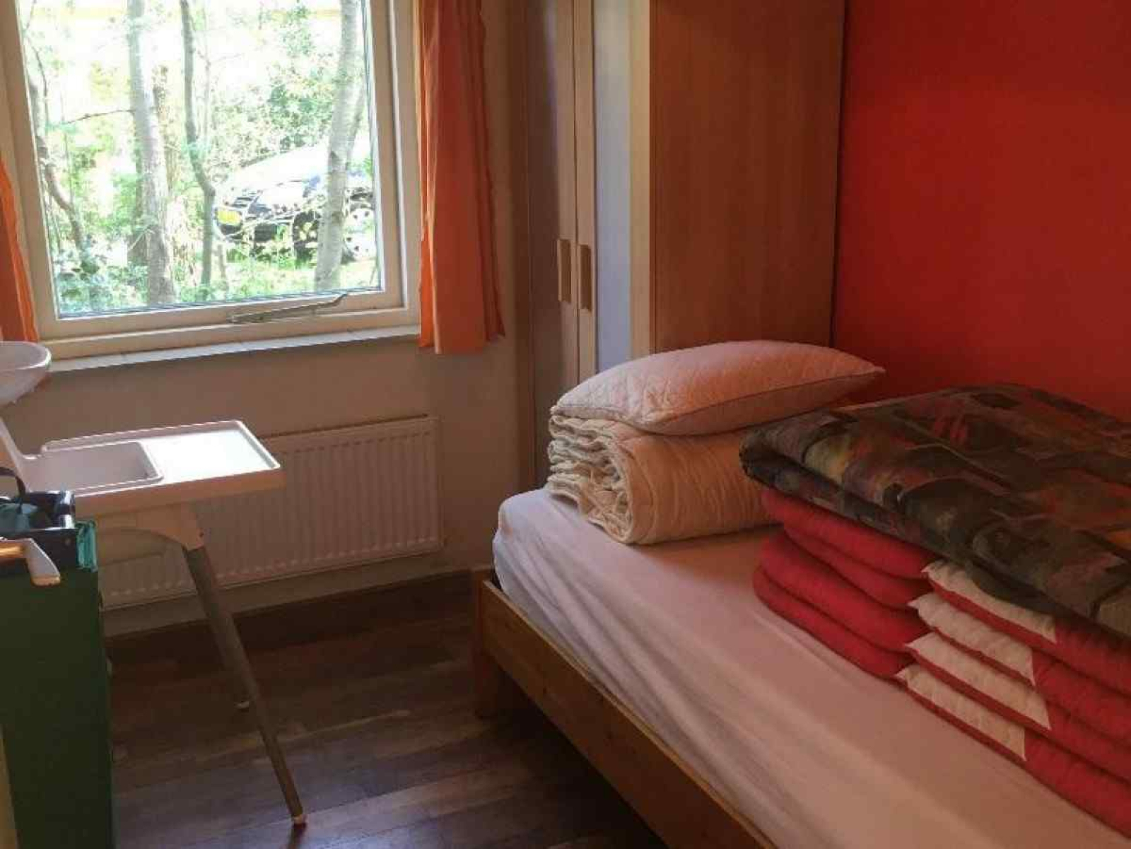There are three bedrooms: one bedroom with a double bed, one bedroom with a bunk bed and one bedroom with a single bed and a "pull-out-bed". There is also a child's bed. You can place this bed in the bedroom with the single bed, or in the bedroom with the bunk bed. There is also a child's chair in the house. The bathroom has a shower and a toilet. Outside there is a spacious garden with garden furniture. There is a lockable barn with a number of bikes where you can make free use of. You can also use Wifi for free. At the cottage there is parking for two cars.